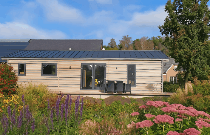 Het stijlvolle zadeldak geeft het chalet een moderne uitstraling en biedt bovendien mogelijkheden voor duurzame toepassingen, zoals het plaatsen van zonnepanelen of een groen dak. Zonnepanelen kunnen tegen een meerprijs worden meegeleverd.
