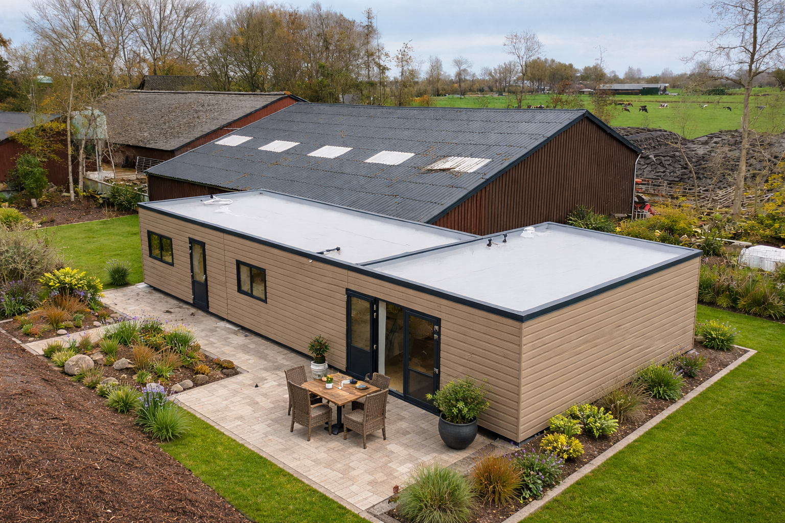 Met een woonoppervlakte van 80 vierkante meter is deze woning ideaal als mantelzorgwoning, permanente woning of vakantiehuis. Met voldoende ramen door de hele woning geniet je in iedere ruimte van een natuurlijke lichtinval. Het platte dak zorgt voor een moderne uitstraling en biedt mogelijkheden voor duurzaamheid, zoals het plaatsen van zonnepanelen. Zonnepanelen kunnen wij tegen een meerprijs plaatsen. Dit chalet is tevens uitvoerbaar met een zadeldak.
