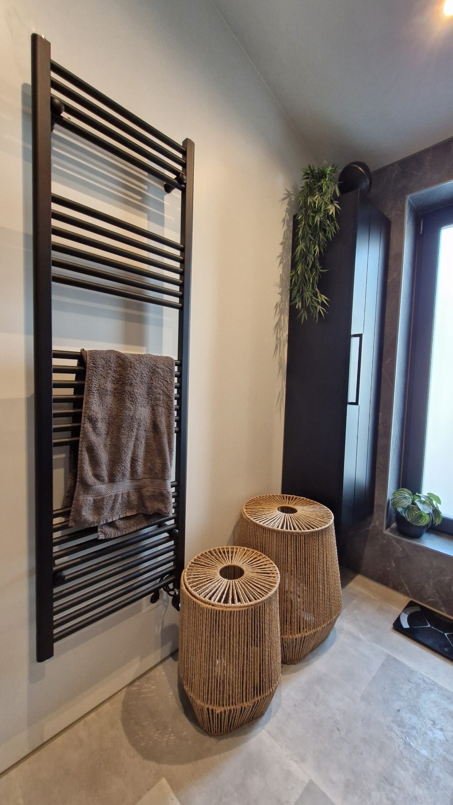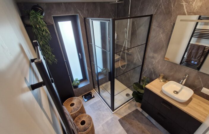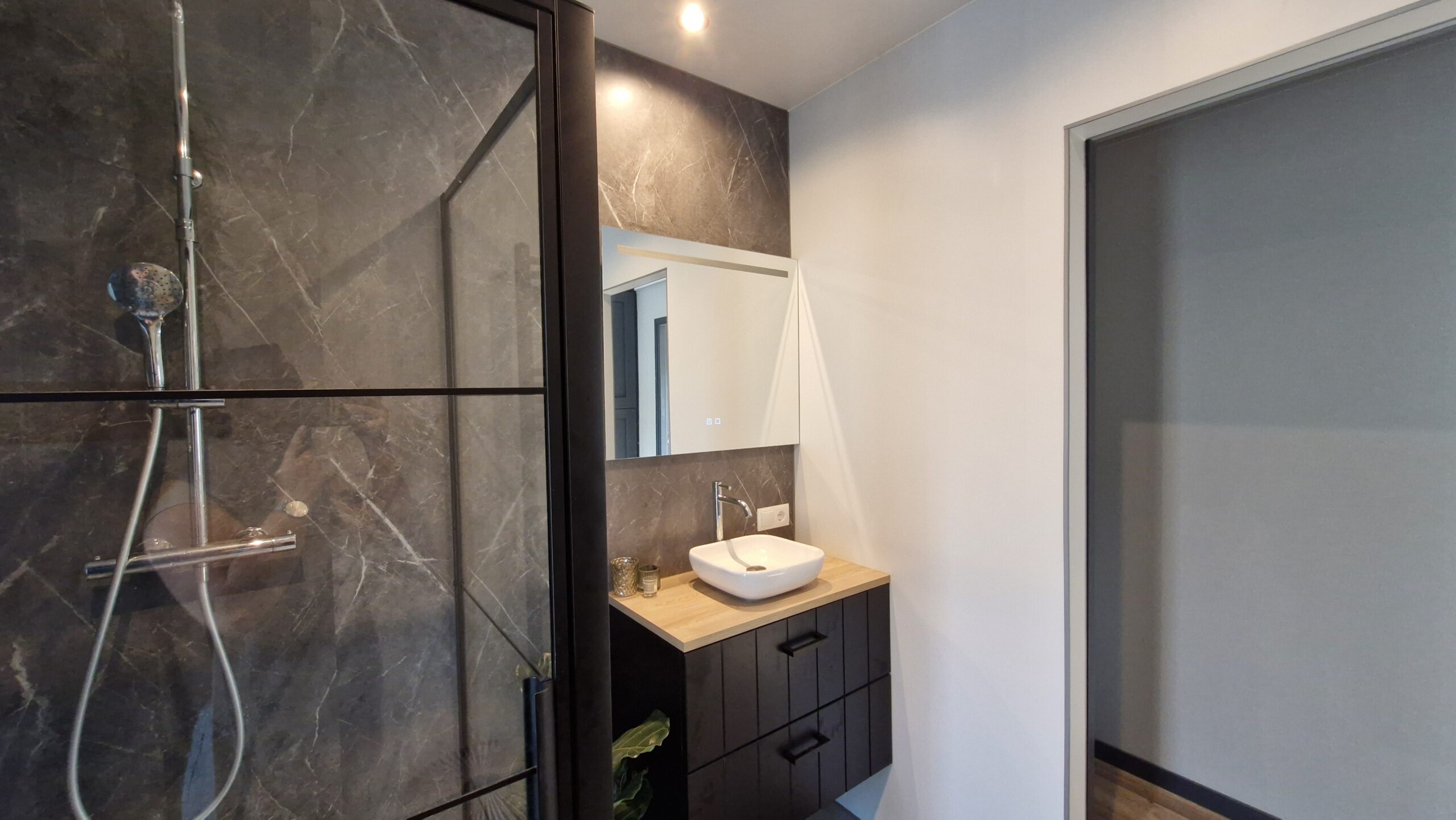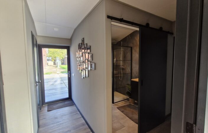 In de entree bevindt zich het toilet, uitgerust met een modern Geberit hangtoilet. Dit type toilet zorgt niet alleen voor een strakke, eigentijdse uitstraling, maar is ook onderhoudsvriendelijk en gemakkelijk schoon te houden.